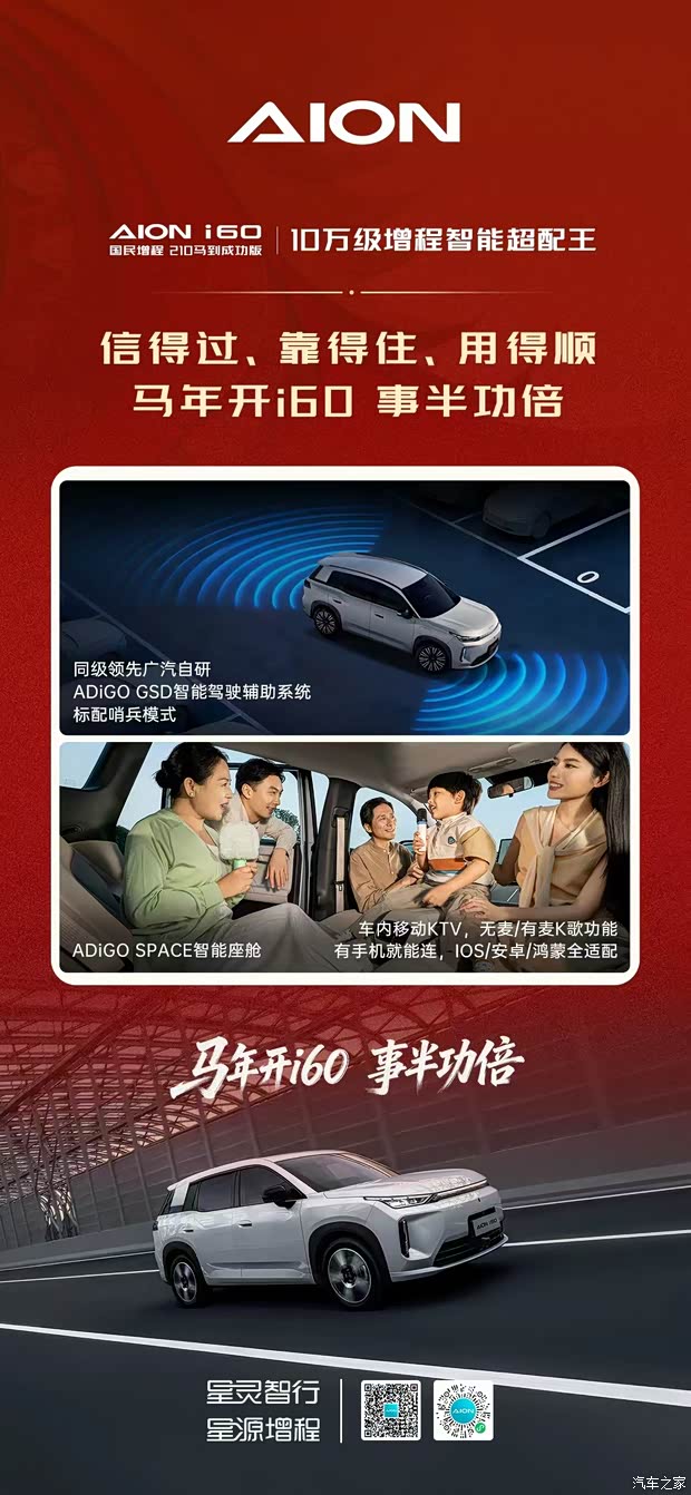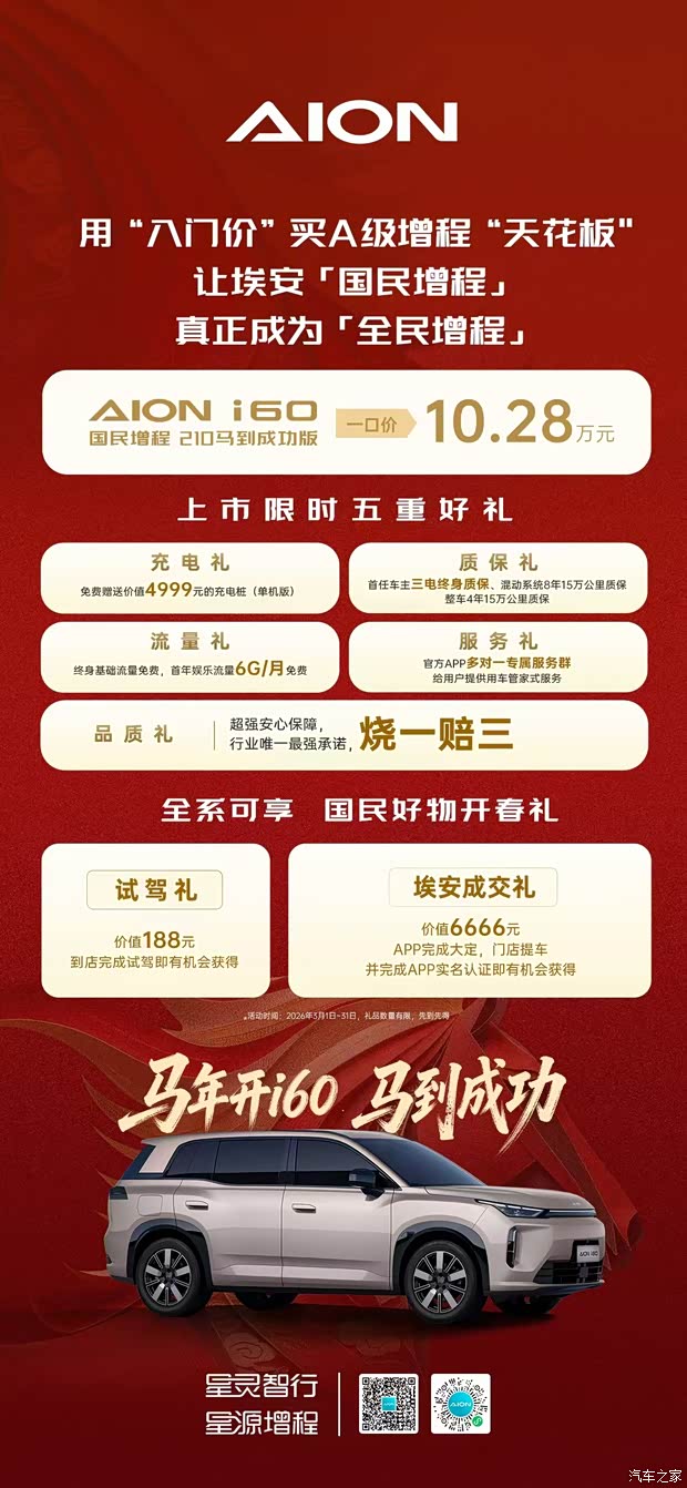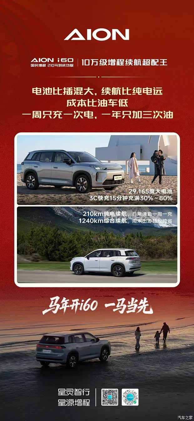 10.28万元开埃安i60国民增程 210马到成功版,一马当先! 29度大电池、210km纯电续航,10万级增程续航超配王! 亏电油耗低、加速快、噪音低,10万级增程技术超配王! 超越B级大空间、豪华5连杆,10万级增程舒适超配王! 超安全、真智能,日行千里,随心而行! #埃安i60国民增程马到成功 #A级210km大电池增程售价10万28