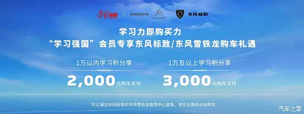 “学习力即购买力”不仅是一句口号,更是“学习强国”学台赋能实体消费、探索“学习积分+”应用场景的生动实践。当指尖的每日积累,转化为车轮上的美好生活,学习的价值便拥有了更丰富的内涵。欢迎广大“学习强国”学台用户走进东风标致与东风雪铁龙全国门店,用您的学习积分,为自己兑换一份前行的动力,亲身感受双品牌全系产品的独特魅力与品质服务。