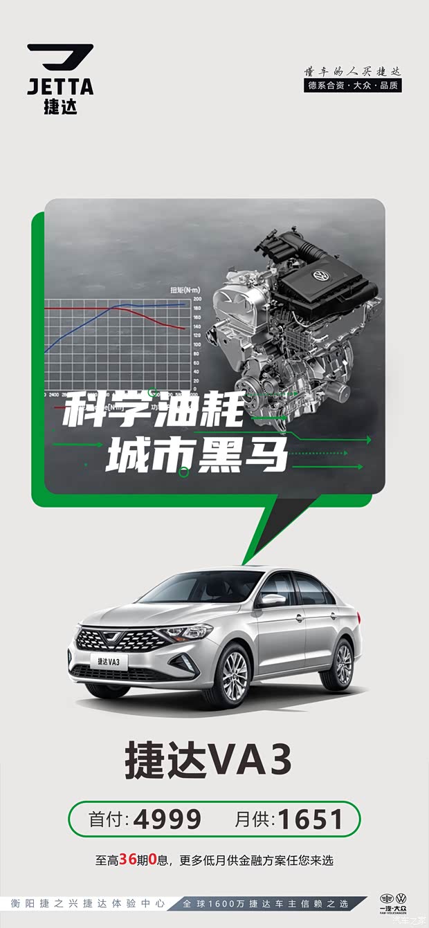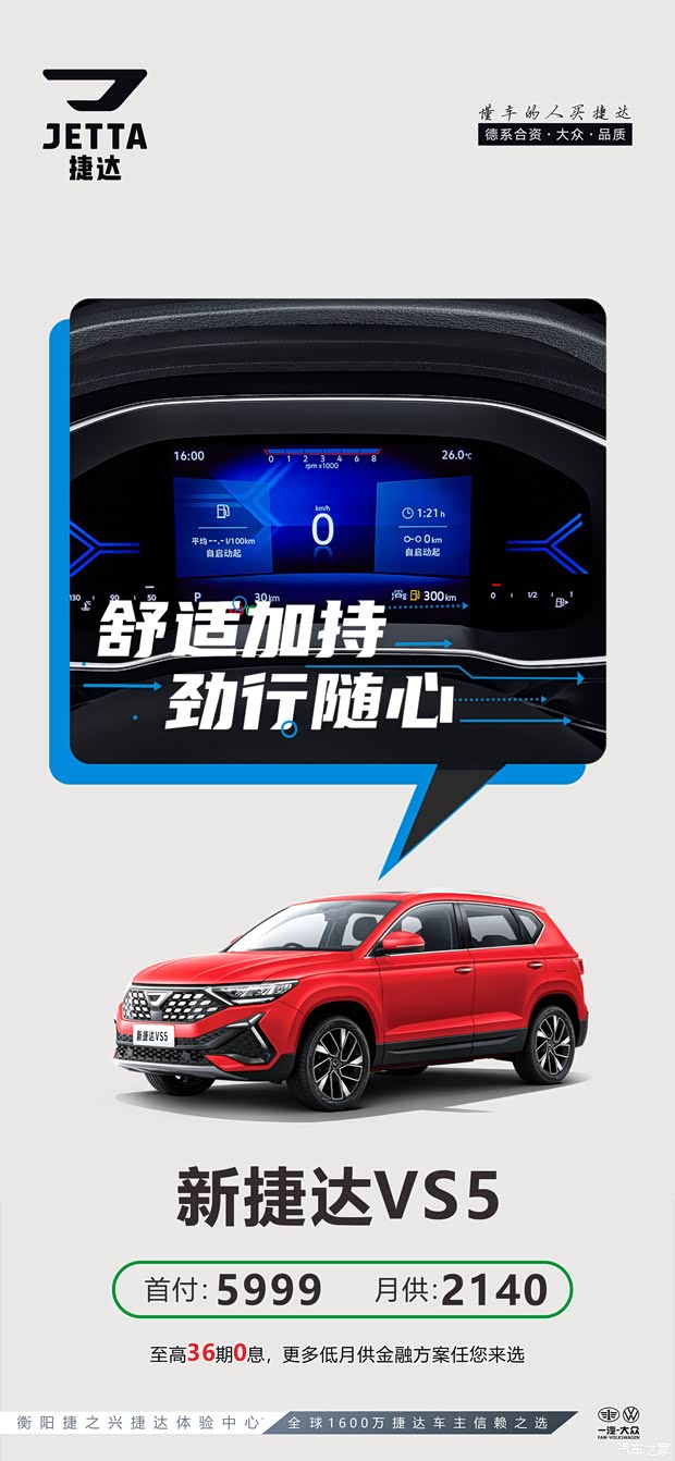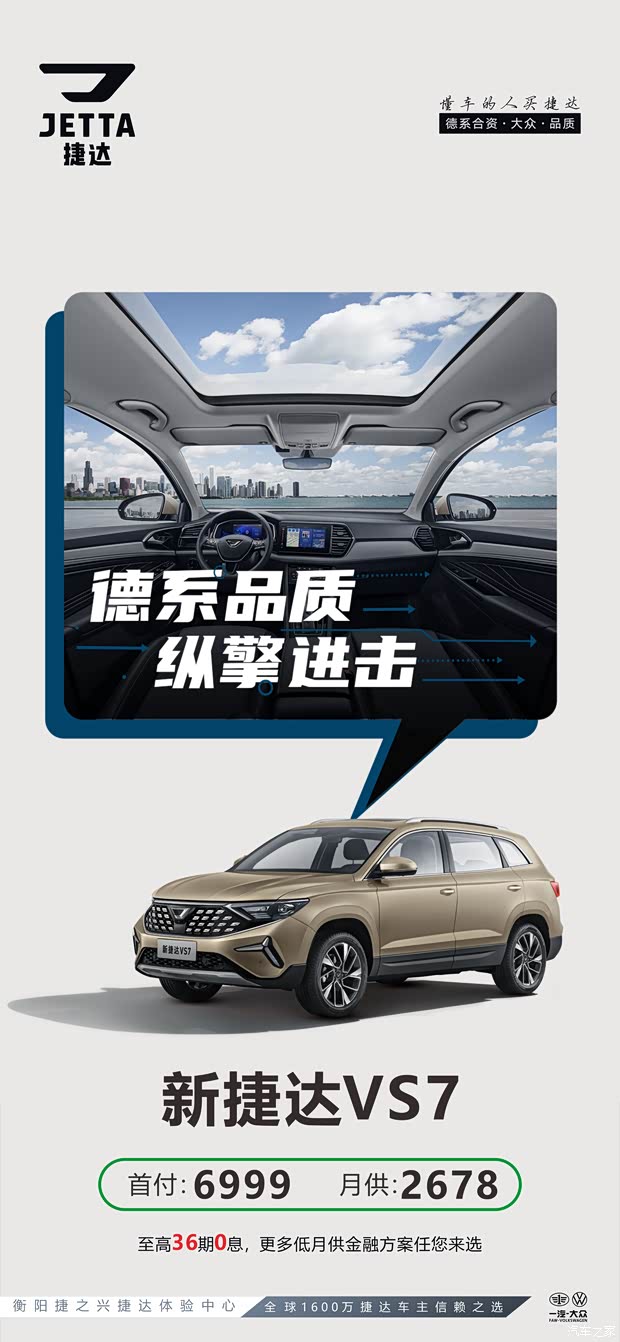 衡阳捷之兴汽车销售有限公司在衡阳地区是一汽大众捷达唯一授权的经销商,是一家于2019年成立专业汽车销售服务公司,隶属于长沙天潮集团,人才力量储备强大,社会资源广泛,资金实力雄厚,公司全体员工团结一心,并立志做一汽大众-捷达汽车最优秀的经销商。公司秉承全员参与、强化管理、精益求精、铸造品质的经营理念,以合作、严格、高效的企业精神和亲情、服务、效率、品质兼备的服务理念。打造行内一流亲情服务体系。温馨舒适的展厅,宽敞整洁,训练有素的服务团队。零距离的现场喜悦交车,消费贷款、二手车置换等多种购车方式,保险、上牌等一条龙服务,公司将以优质的服务、一流的技术,有毅力、有激情、有信心、有担当的工作态度,执着的做好每一件小事,服务好每一客户。