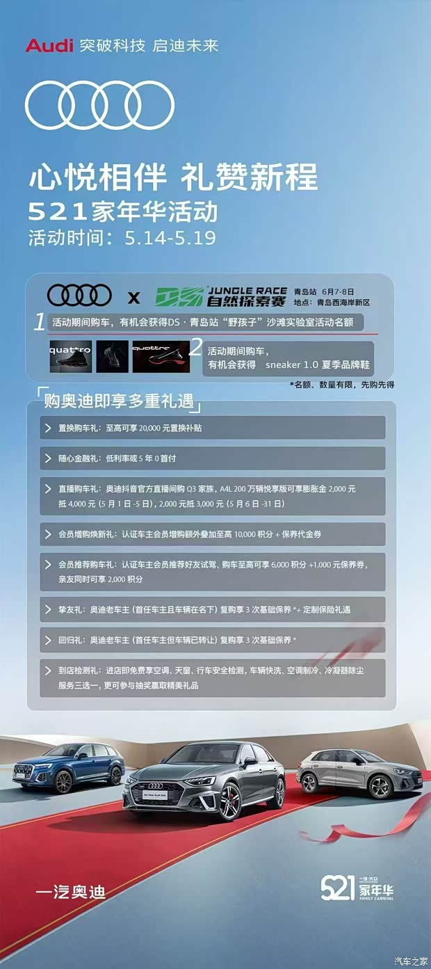 >直播购车礼:奥迪抖音官方直播间购 03 家族,A4L 200 万辆悦享版可享膨胀金 2,000元抵3,000元