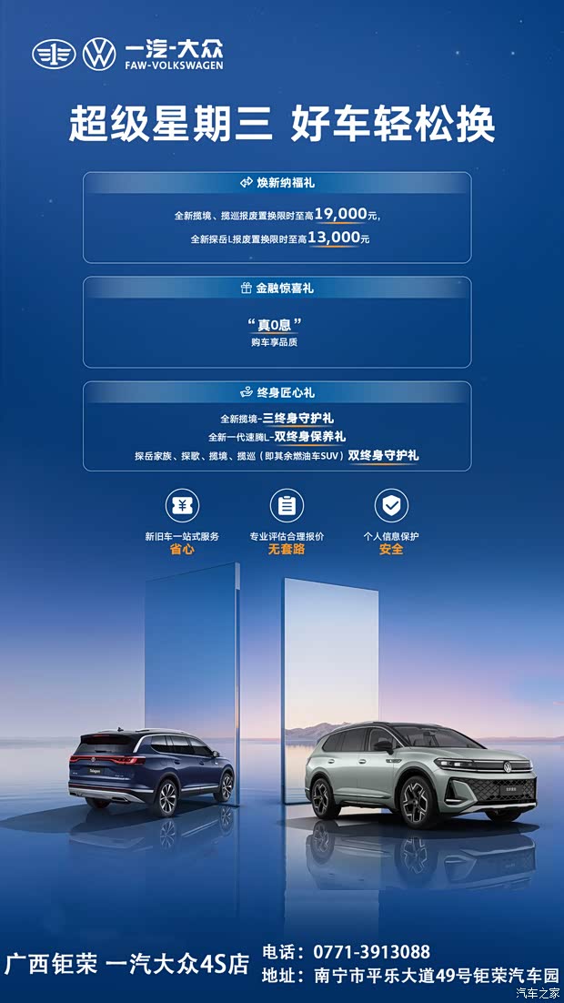惊喜福利不断,老友们我们一起相约2月11日,一汽大众广西钜荣店,让我们解码良心置换新主张!