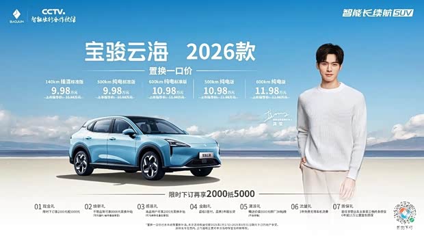 宝骏云海2026款共推出五款配置随心选,包括140km 插混标准版、500km 纯电标准版,600km 纯电标准版、500km 纯电版及600km 纯电版,置换一口价9.98万元-11.98万元。同时为感谢用户信赖,回馈广大用户的支持,宝骏云海2026款特别推出七重购车礼遇:即日起下订即可享至高10000元置换补贴,限时再享2000元订金抵5000元现金好礼!更多精彩权益,可通过宝骏汽车APP/小程序等线上渠道下订或到店咨询体验。