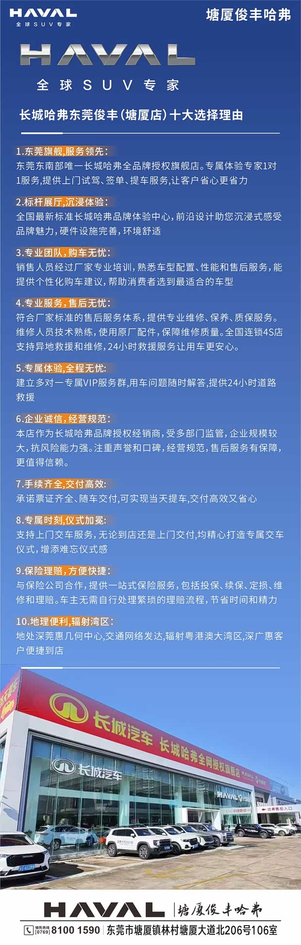 公司简价:东莞市俊丰汽车销售服务有限公司是一家长城厂家授权的东莞区域规模最大、服务第一的哈弗旗舰店