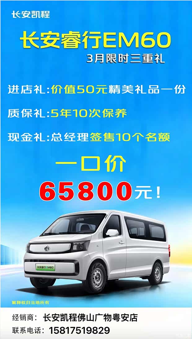 🔥长安睿行EM60 3月限时福利来袭! 一口价仅需65800元! 进店即送精美礼品,总经理签售名额有限,手慢无! 📍长安凯程佛山广物粤安店 📞 15817519829 #长安睿行EM60 #新能源商用车 #创业好帮手