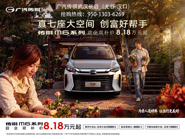 【广汽传祺武汉长启(光谷和汉口)】车源保证,诚信有佳,服务更佳! 武汉市首家GAC-TRUMPCHI店 传祺M6 限时补贴至高23000元! 【传祺M6】 【限时补贴礼】至高补贴23000元 【置换礼】置换补贴至高6000元 【广汽传祺武汉长启店】让您安心购车、购安心车。 地址: 武汉东湖新技术开发区大学园路88号中冶南方对面(广汽传祺武汉长启店)