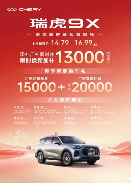 佳节之际,瑞虎9X推出全新政策:2026年1月1日-2026年1月31日,购车即享限时换新加补13000元(不含国补),另外再享购车基金15000元+置换补贴至高20000元。三重优惠加持,诚意直接拉满!