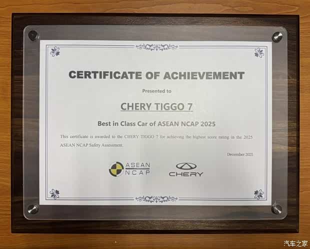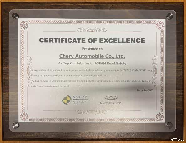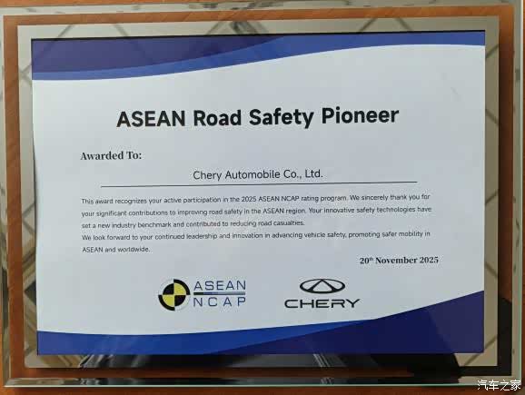 作为东盟地区权威的汽车安全评测机构,东盟新车安全评鉴协会(ASEAN NCAP)的测试体系全面覆盖正面碰撞、侧面碰撞,以及对乘员保护、行人保护等多个关键维度。瑞虎7在这一高标准体系下斩获ASEAN NCAP五星安全评级,并在年度车型评选中进一步荣获“ASEAN NCAP 2025最佳车型”,充分展现其行业领先的安全实力。同时,ASEAN NCAP官方还授予了奇瑞“东盟道路安全先锋奖”及“最佳贡献奖”,从产品到品牌,全面肯定了奇瑞在东盟地区推动道路安全的杰出贡献。