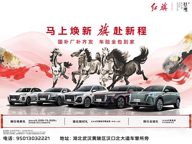 马上焕新,旗赴新程,国补厂补齐发,车险全包到家!武汉泰岳红旗在期间让您拥有一个完美的购车体验,福利多多,优惠多多,欢迎到店或致电了解。