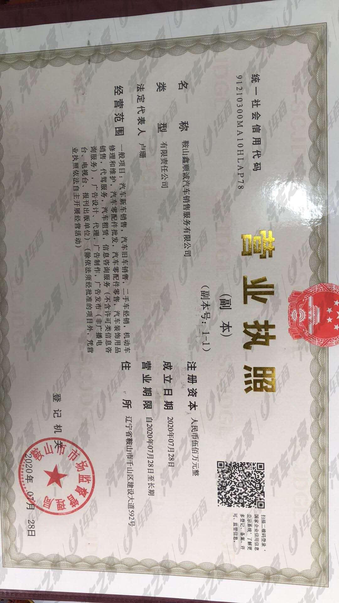 鞍山鑫顺诚成立于2020年7月28日,本店主要经营BEIJING和北京越野品牌为主,公司以整车销售(Sale)、零配件(Sparepart)、售后服务(Service)、信息反馈(Survey)等一体化4S店。经营范围有:汽车新车销售,汽车旧车销售,二手车经销,机动车修理和维护,汽车零配件批发,汽车零配件零售,汽车装饰用品销售。
