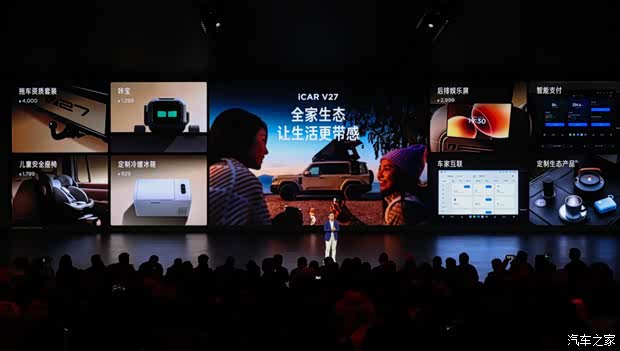 座舱生态同样贴合家庭需求,iCAR V27 的智能座舱集成生态坞 APP、智家 APP,可实现车内儿童安全座椅、冷暖冰箱等定制配件的集中控制,还能实现车与智能家电的跨平台互控,出门前可通过车机开启家中空调、灯光,到家后可通过家居设备联动车机解锁、开启后备箱,打通出行与居家生活的壁垒,构建起人 - 车 - 家 - 户外的完整生态闭环。