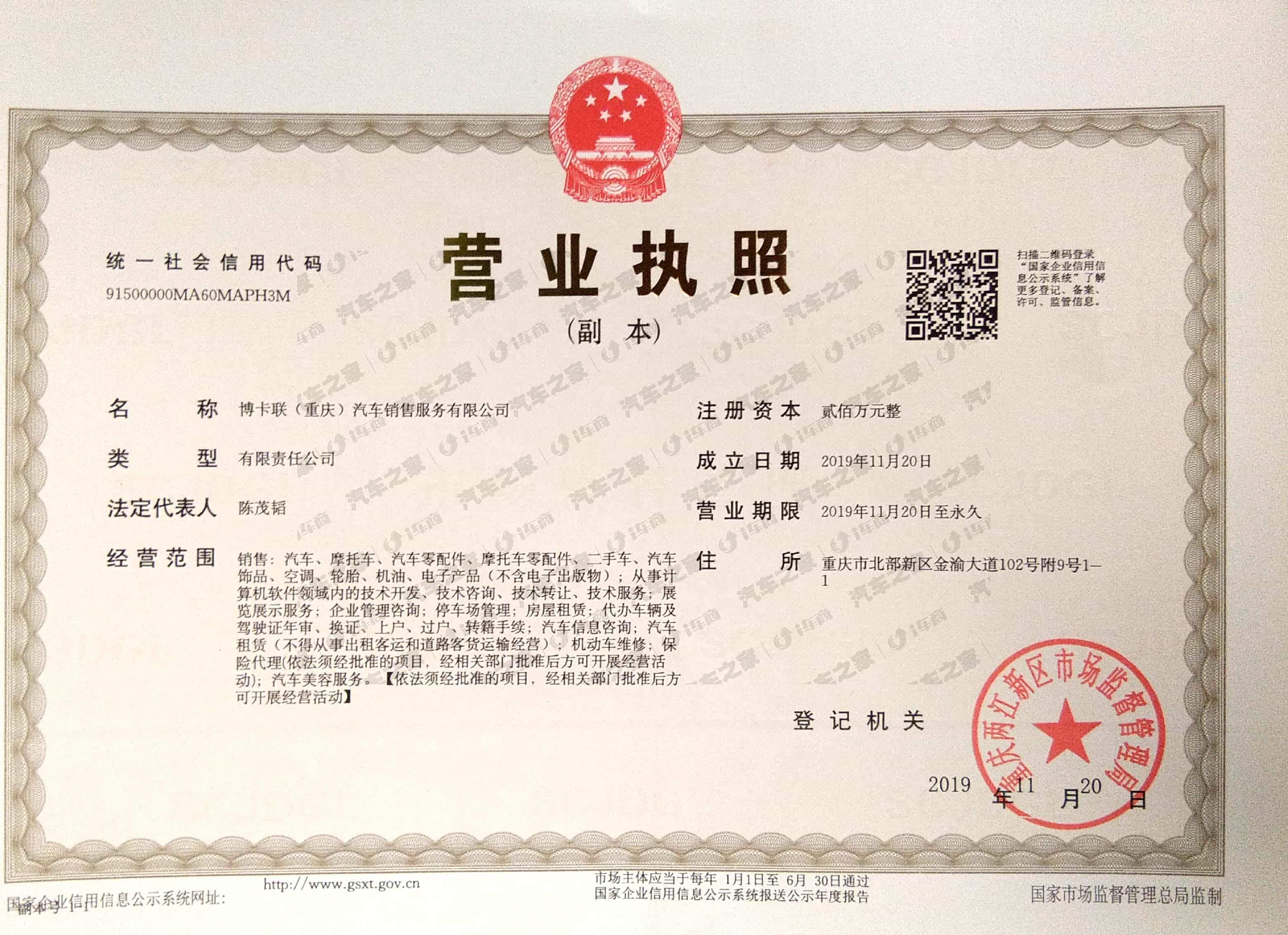 博卡联(重庆)汽车销售服务有限公司是一家从事新能源汽车销售及售后服务的专业4S店销售服务中心,公司占地4500平米,位于“全国十大汽车交易市场”重庆汽博中心,公司拥有各项专业新能源汽车检测维修设备及销售服务资质,为吉利几何汽车重庆指定授权经销商。
