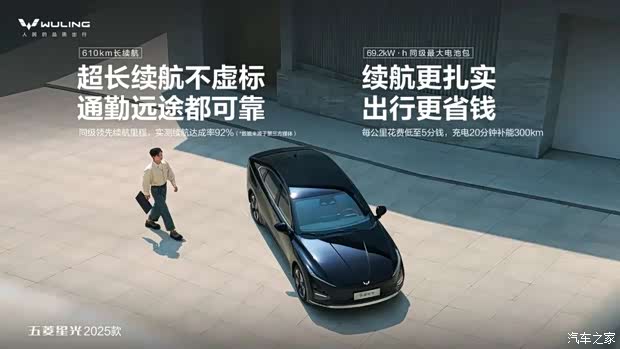 五菱星光2025款整车搭载了69.2kWh的神炼电池组,让CLTC纯电续航里程提升至610km,进一步满足了日常城市通勤和短中途出行需求。