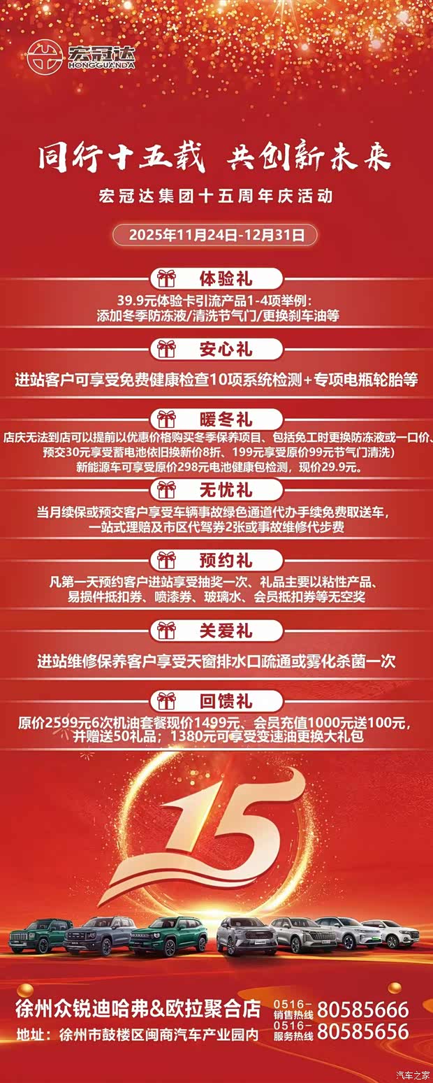 宏冠达集团15周年庆 同行十五载 共创新未来 邀约到店即有精美礼品赠送 15台特价车先到先得 交99抵2000元购车补贴 活动时间:11月24日-12月31日 HAVAL 众锐迪哈弗金山桥店 福利热线 : 0516-80585666