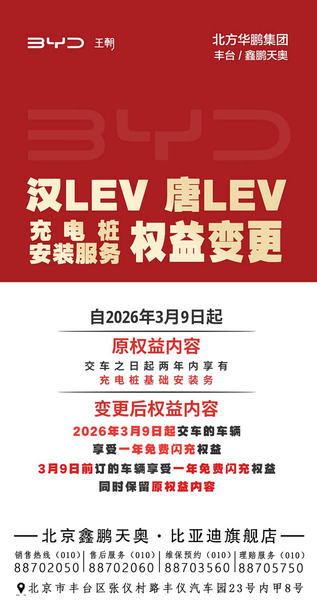 比亚迪王朝网汉 LEV、唐 LEV 车型充电桩安装服务权益,自2026 年 3 月 9 日起正式调整!