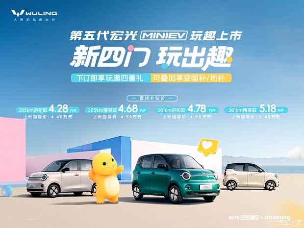 新四门,玩出趣!从开创代步车新赛道到收获全球190万用户信赖,从卫冕微型新能源汽车销量首位到持续引领品类向上,上汽通用五菱始终坚守“人民需要什么,五菱就造什么”的初心,以每一代产品的满级进化回应用户期待。第五代宏光MINIEV传承家族爆款基因,全面进化的产品力与玩趣理念,实现了代步车品类的代际领先。未来,上汽通用五菱将继续以品类开创者与市场领导者的姿态,陪伴更多用户开启有趣、有爱的代步出行生活。