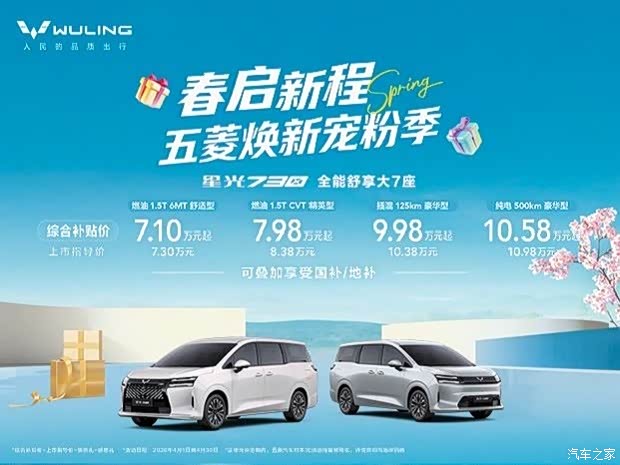 为适应新时代家庭出行需求,五菱以“新空间、新科技、新动力、新底盘、新研发、新智造”六大全新黄金标准,打造新时代人民的MPV。星光730拥有同级最大“新空间”和同级唯①的电滑门“新科技”,并搭载同级唯①的一车三动力,以“新动力”满足多元出行选择;采用前后双独悬的“新底盘”,让好开和舒适可以兼得。五菱还持续推进“新研发”,打造“天”“灵”“神”三大系列自主科技,结合全球领先的智能岛制造体系(I²MS),以国际领先的“新智造”实力,为星光730带来值得信赖的品质保障。
