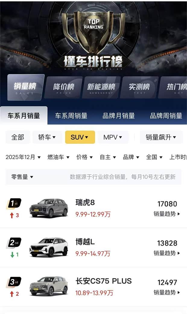 近日,奇瑞瑞虎8交出亮眼答卷:2025年12月销售17080台,强势登顶自主品牌燃油车guanjun宝座,更连续10个月蝉联自主品牌燃油中型SUV销量榜首。在新能源浪潮不断冲击行业格局的当下,瑞虎8家族凭借持续的产品迭代与技术积淀,展现出“中国新燃油”的强劲韧性与进化动能。
