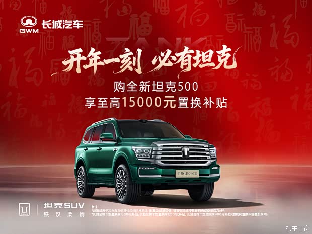 - 舒享无忧礼:新春购车享价值5000元科技包、价值8000元座椅按摩包(座椅按摩包仅全新坦克500 Hi4-T 智享版享受)