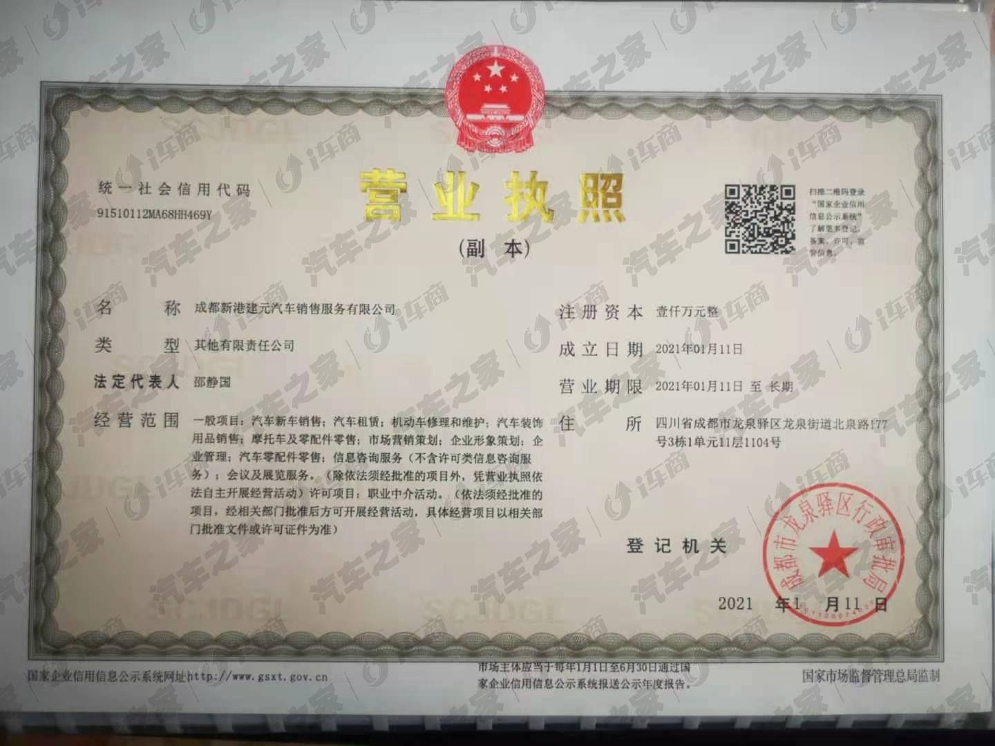 成都新港建元是比亚迪品牌旗舰店之一,是中国成都的比亚迪经销商集团—新港集团下企业。公司于2021年11月正式营业,是比亚迪品牌汽车成都地区授权经销商。公司位于成都市龙泉驿区汽车城,公司地址:成都市龙泉驿区大面街道经开区南二路566号。占地面积5000平方米,拥有900多平米的豪华销售展厅,超过3000平方米的售后服务中心。