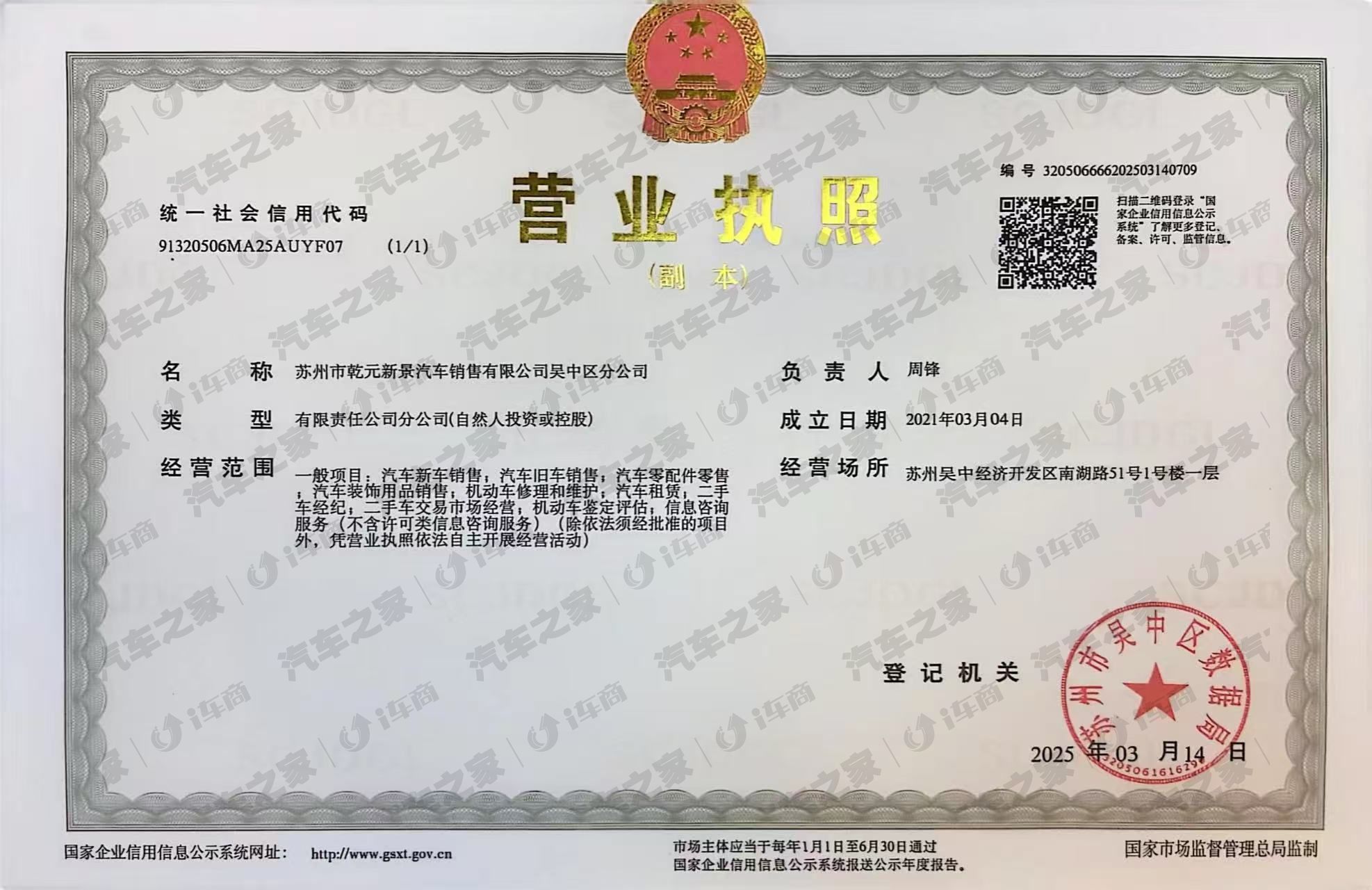 苏州市乾元新景汽车销售有限公司吴中区分公司