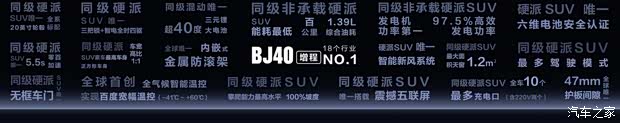 BJ40增程围绕“超级硬派、超级增程、超级越野、超级智享、超级安全”五大核心优势,实现了多项行业领先,包括同级硬派SUV素车最高车身、同级硬派SUV全系标配20英寸轮毂、同级硬派SUV无框车门、同级混动超40度三元锂大电池、同级非承载硬派SUV能耗最低、同级非承载硬派SUV发电机功率第一、同级硬派SUV最快零百加速、全球首创全气候智能温控实现百度宽幅温控、同级硬派SUV拥有最多驾驶模式、同级硬派SUV三把锁+智电全时四驱、同级硬派SUV攀爬能力最高水平、同级硬派SUV搭载震撼五联屏、同级硬派SUV最大面积天窗 1.2m²、同级硬派SUV最多充电口、全球内嵌式金属防滚架、硬派SUV六维电池安全认证、全球47mm护板间隙、硬派SUV智能新风系统。