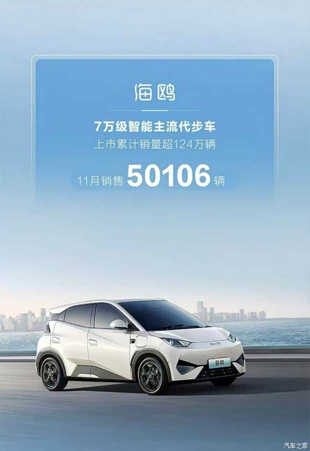 近日,比亚迪海洋网公布11月销量数据,单月销量达233431辆,延续一贯强势表现,旗下“百万销量俱乐部”明星车型、新一代主流代步车——比亚迪海鸥成绩尤为亮眼,11月热销50106辆,1-11月累计销量已达414102辆,上市累计销量已超124万辆,以高价值产品路线、迭代式全新体验,持续引领新能源汽车A00级市场向上发展。