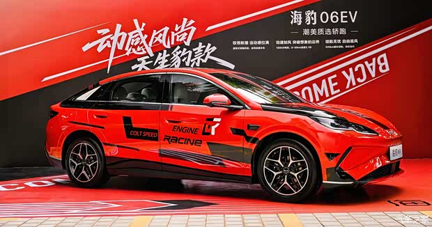 广州发布会现场,一台鲜红车身搭配钢琴黑赛道条纹的海豹06EV痛车惊艳亮相,颠覆性的撞色设计,展现年轻凌厉的高颜值,引爆全场焦点。