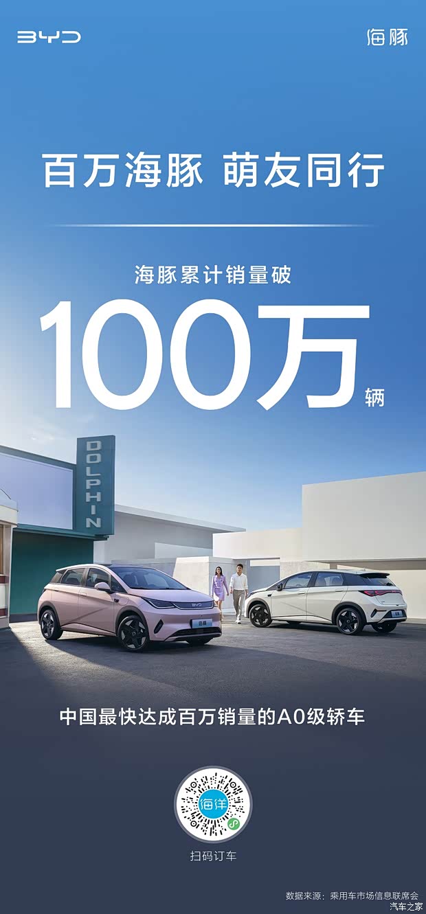 历经四年的市场检验,海豚销量突破100万辆,为A0级轿车市场向上发展注入更多积极能量,持续助推细分市场向精品化、高质量阶段迈进。百万用户的优秀口碑,再次印证了海豚的出色产品力和可靠品质。未来,海豚将以用户需求为导向持续迭代,为更多萌友打造更美好出行体验。