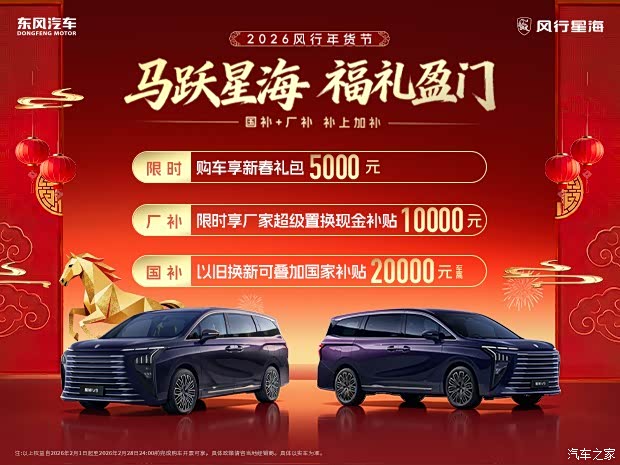 马年新春佳节来临之际,东风风行特为星海V9购车用户推出多重好礼。即日起,购车可享5000元新春礼包和限时享厂家超级置换现金补贴1万元等,并且以旧换新可叠加国家补贴2万元,国补+厂补的丰富权益,真心实意助力新春购车用户,用更轻松的入手价格,解锁远超同级的出行新体验。