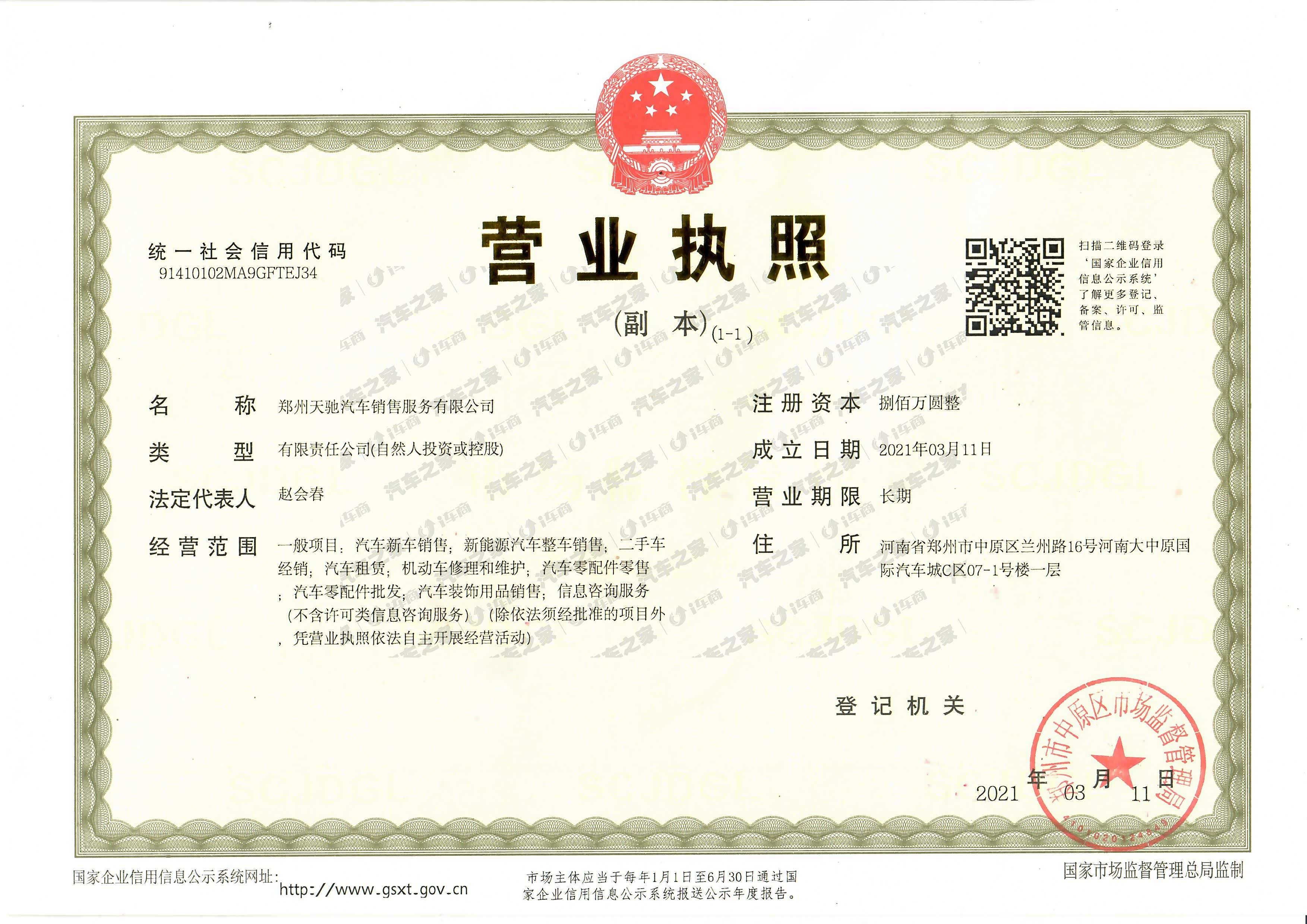 郑州天驰汽车销售服务有限公司,是一家由比亚迪汽车厂家正式授权的新能源汽车4S店特许经销商,成立于2021年,注册资金800万。主要经营比亚迪“海洋网”品牌。位于郑州市中原区中原西路大中原汽车城院内,曾荣获比亚迪品牌豫北区域优秀奖、2023年豫北大区杰出商家贡献奖、23年抖音最有价值经销商奖