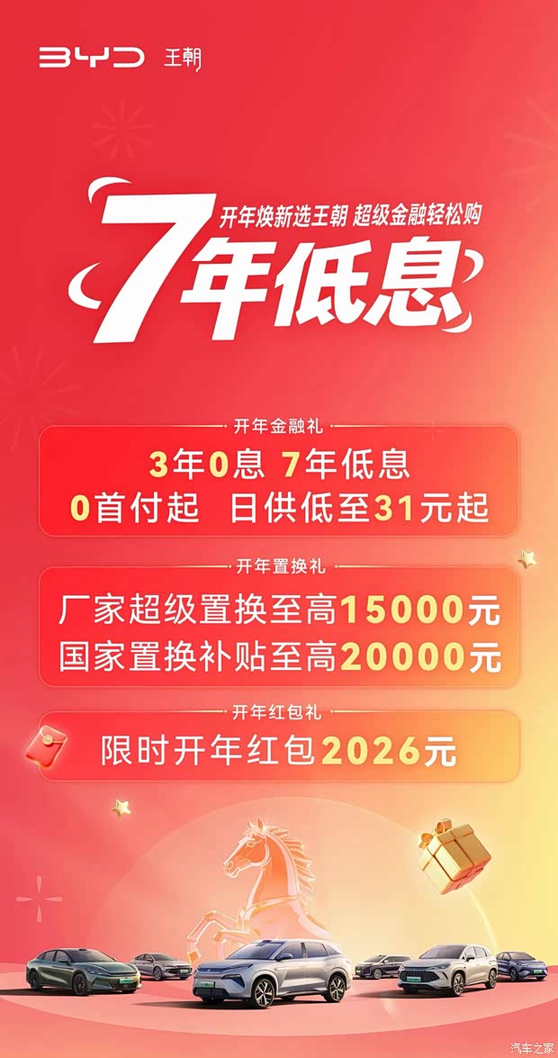 辞旧迎新,开年焕新正当时!王朝超品金融节重磅来袭,轻松购车无压力,多重好礼等你拿! 🔥 开年金融礼 3年0息、7年低息任性选,还有0首付起,日供低至31元起,买车就像带杯奶茶回家一样轻松~ 💰 开年置换礼 厂家超级置换补贴至高15000元,叠加国家置换补贴至高20000元,旧车换新车,简直不要太划算! 🧧 开年红包礼 限时开年红包2026元,手快有手慢无,直接抵扣车款!