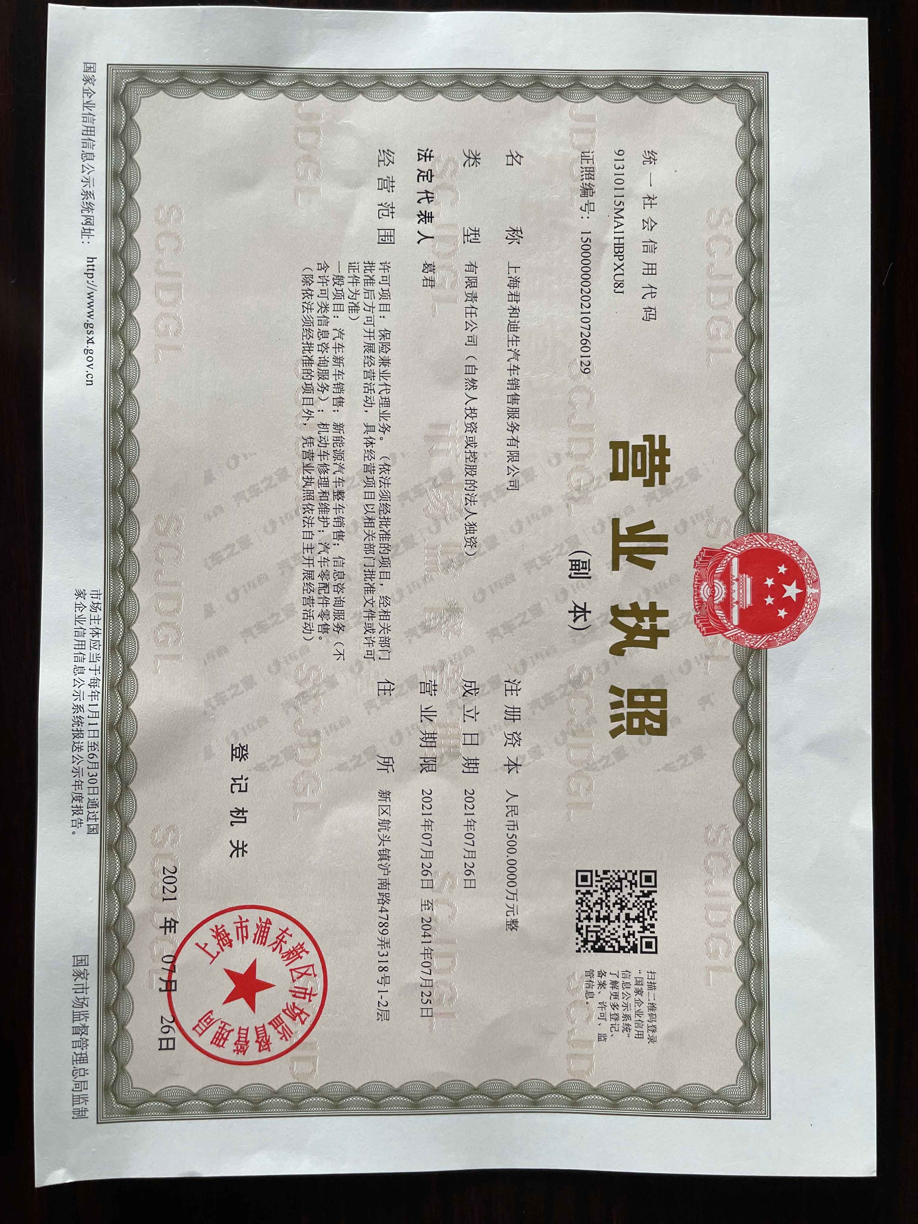 上海君和迪生汽车销售服务有限公司于2021年7月26日成立。法定代表人葛君,公司经营范围;许可项目:保险兼业代理业务。(依法须经批准的项目,经相关部门批准后方可开展经营活动,具体经营项目以相关部门批准文件或许可证件为准)。一般项目:汽车新车销售;新能源汽车整车销售;信息咨询服务(不含许可类信息咨询服务);机动车修理和维护;汽车零配件零售。(除依法须经批准的项目外,凭营业执照自主开展经营活动)