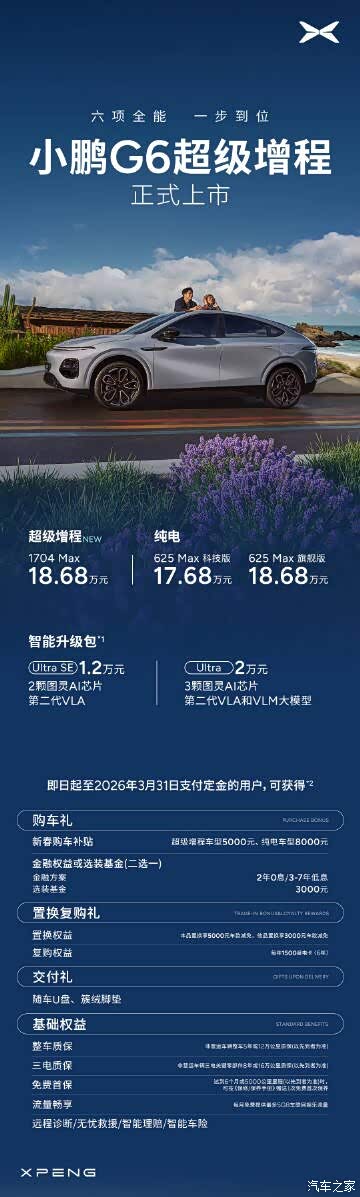 六项全能一步到位,小鹏G6超级增程正式上市!售价18.68万元!