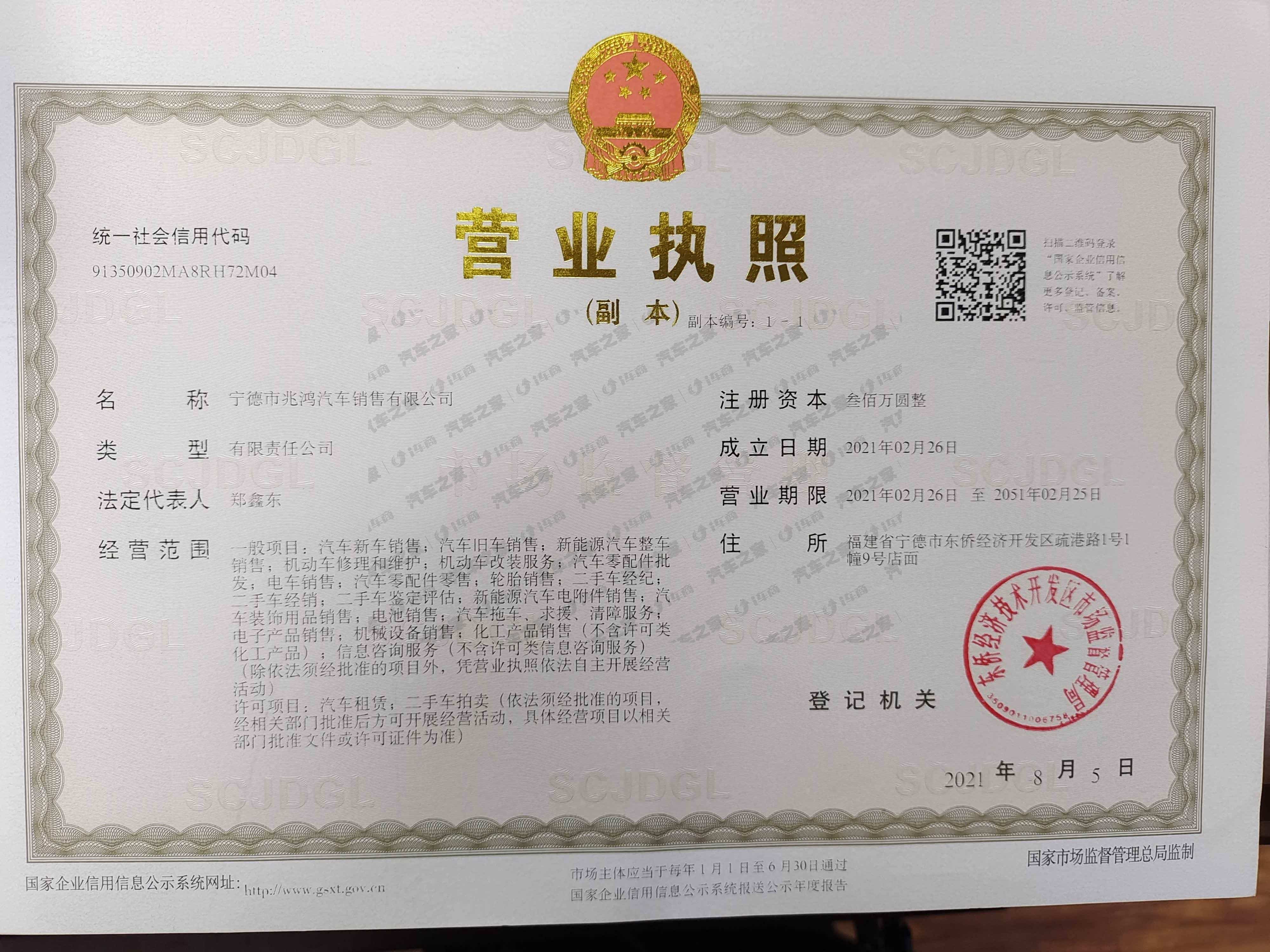 宁德市兆鸿汽车销售有限公司成立于2021年10月,为比亚迪宁德地区经销商。