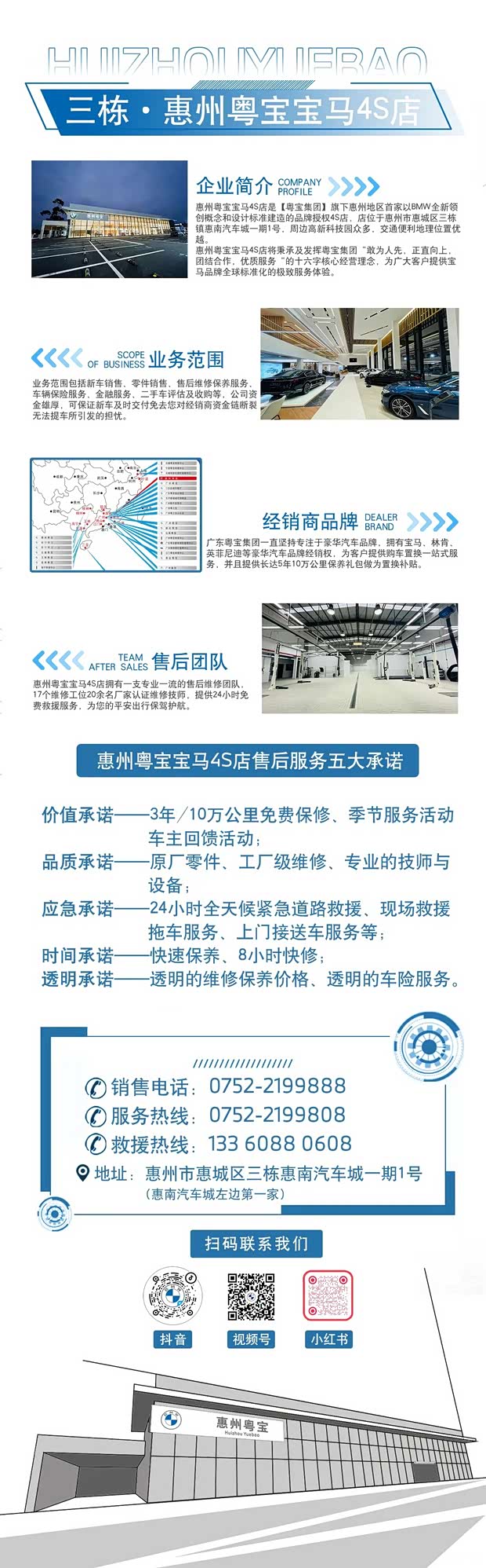 惠州粤宝一直以“正直向上,敢为人先”创新的企业文化指导经营,始终如一地贯彻BMW以客户为导向的服务理念,用专业的团队,透明的价格、优质的服务。