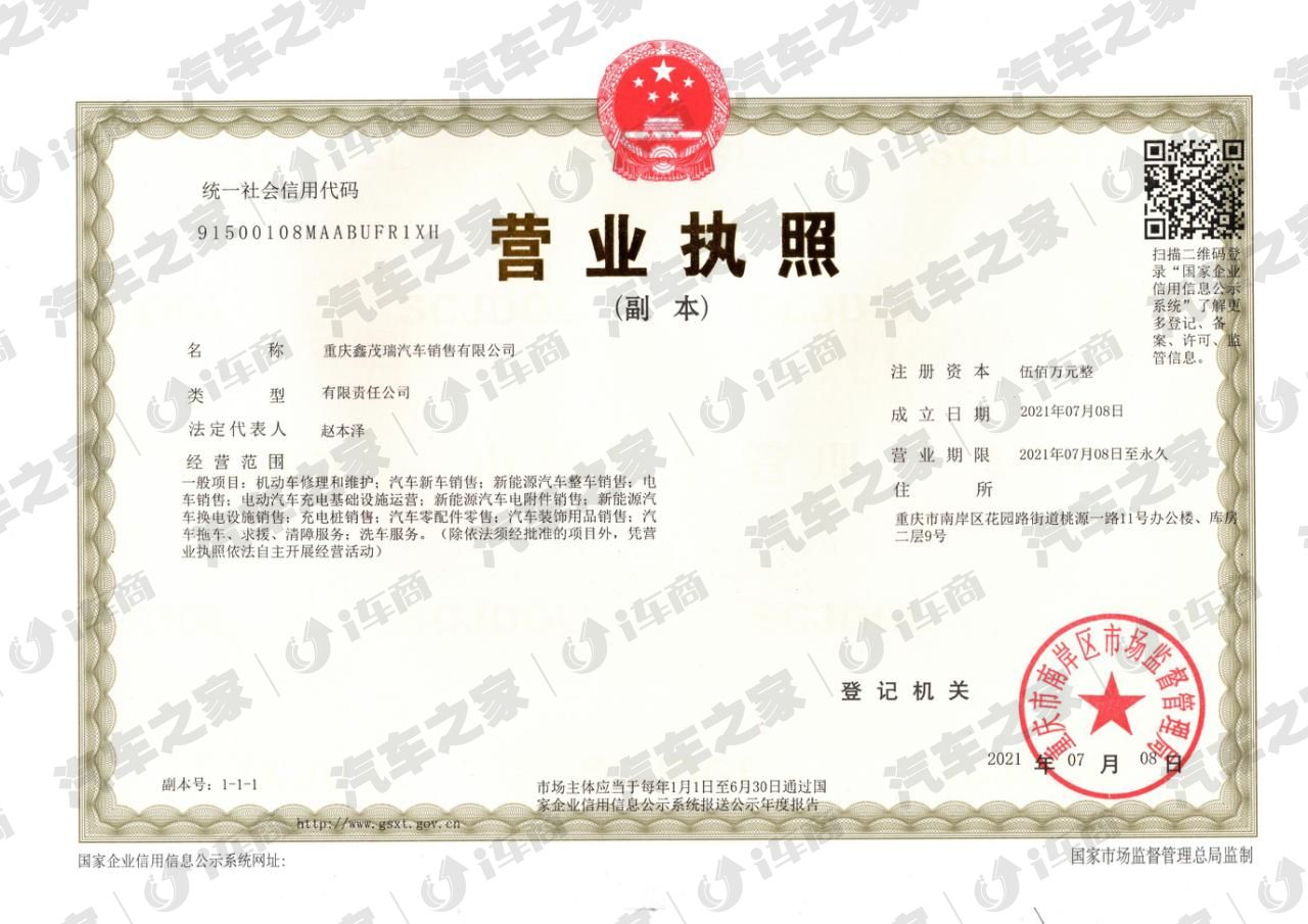 重庆鑫茂瑞汽车销售有限公司于2021年7月28日注册成立,目前公司新址位于重庆市南岸区花园街道桃源一路11号国泰汽车E电园A区负一层(环线海峡路站5号出口下行500米,丹龙路公交车站旁)公司系重庆市奇瑞汽车一级经销商,是按奇瑞要求建设的标准4S店,总占地2800余平方米,其中汽车展厅1000余平方米,维修车间1800余平方米,办公区域400余平方米,设施齐全。 公司拥有一支具有资深行业经验的的管理、营销队伍,现有员工40余人。其中:中高级管理人员8人,销售策划人员10余人,维修服务人员20余人,后勤保障人员5人。