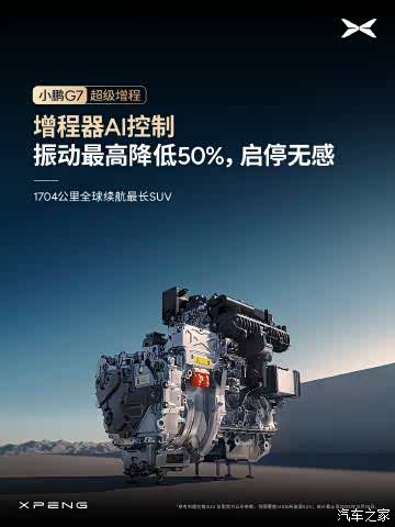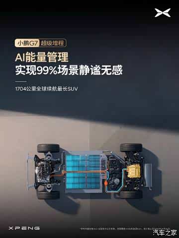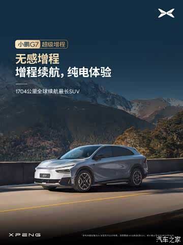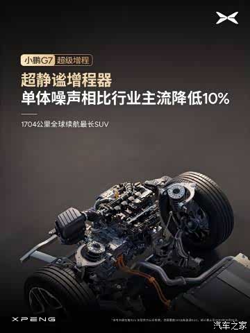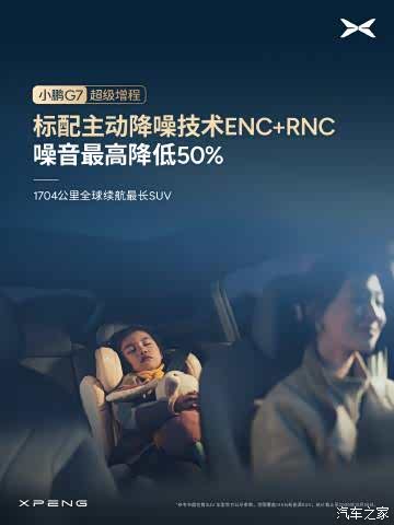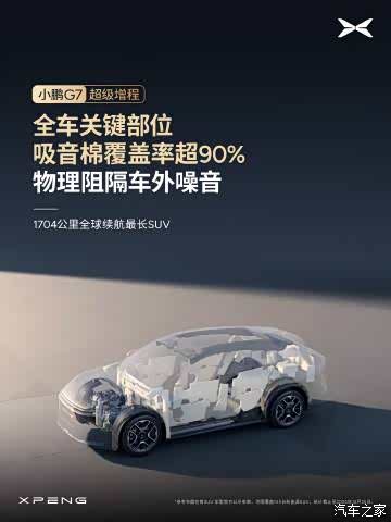 小鹏 G7 超级增程 无感增程|增程续航,纯电体验 · 全系标配主动降噪技术 ENC+RNC,噪音最高降低 50% · 增程器 AI 控制,振动最高降低 50%、启停无感 · AI 能量管理,实现 99% 场景静谧无感 · 全车关键部位吸音棉覆盖率超 90%,物理阻隔车外噪音 · 超静谧增程器,单体噪声相比行业主流降低 10% 1704 公里全球续航最长 SUV ,静享从容出行~