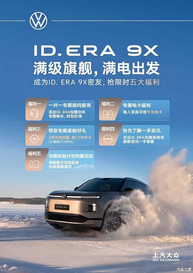 即日起成为 ID.ERA 9X 密友,可享五大专属福利:一对一专属顾问,购车用车全周期响应;每周至高 99 度电,累计千度电卡,通勤用电成本直降;3 年无忧流量 + 热门 VIP 年卡,承包出行娱乐;一手资讯抢先看,上市动态早知道;先锋体验计划,亲临官方活动现场深度试驾。德系百年工艺 + 中国智能科技,30 万级六座增程 SUV 新标杆,预售现已开启,扫码锁定权益!