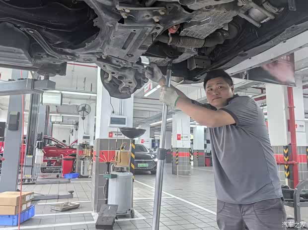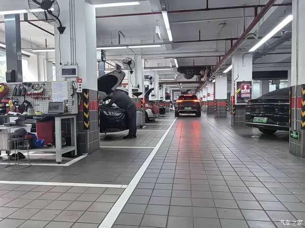 进门就被震撼了。工作人员介绍,这里售后面积超过7000平方米,很大的比亚迪4S店之一。车间里整齐排列着200个维修工位,举升机、四轮定位仪、大梁校正仪一应俱全,全是比亚迪认证设备。