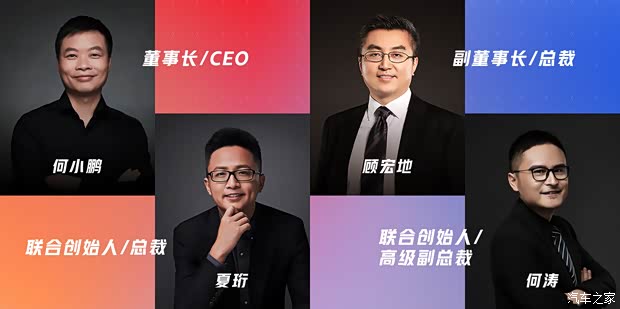 何小鹏是UC优视联合创始人及前阿里巴巴移动事业群总裁,现担任小鹏汽车董事长 CEO;夏珩、何涛两位小鹏汽车联合创始人,毕业于清华大学汽车工程系,两人此前在广汽研究院负责新能源汽车和智能汽车控制系统的开发工作,夏珩现担任联合创始人、总裁,何涛现担任联合创始人、高级副总裁;顾宏地博士,前摩根大通亚太区投行主席,于2018年3月加盟小鹏汽车,担任小鹏汽车副董事长、总裁。来自互联网、汽车制造和战略融资三个领域富有差异的管理团队塑造了小鹏汽车独特的DNA。