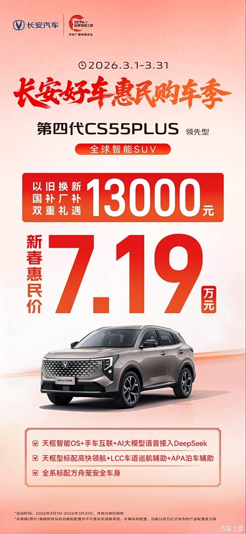 长安好车惠民购车季 第四代CS55PLUS领先型全球智能SUV 0首付 0利息 5年长周期低月供、购车送全险 13000以旧换新国补厂补双重礼遇 天枢智能OS+手车互联+AI大模型语音接入DeepSeek 天枢型标配高快领航+LCC车道巡航辅助+APA泊车辅助 全系标配方舟笼安全车身 活动时间:2026年3月1日-2026年3月31日,详询当地经销商
