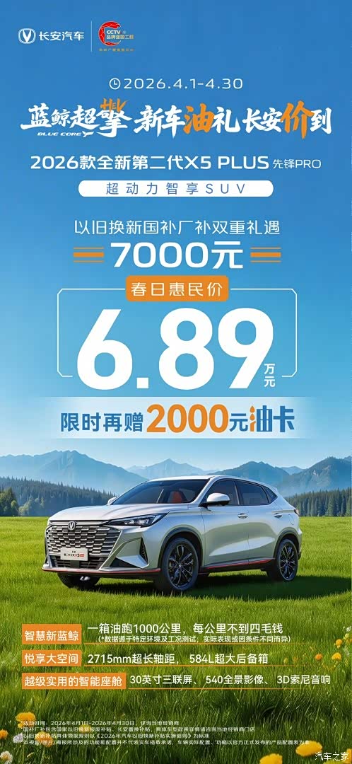 长安汽车蓝鲸超擎新车油礼长安价到 2026款全新第二代X5 PLUS先锋PRO超动力智享SUV 以旧换新国补厂补双重礼遇7000元 春日惠民价6.89限时再赠2000元油卡 智慧新蓝鲸一箱油跑1000公里,每公里不到四毛钱 悦享大空间 2715mm超长轴距,584L超大后备箱 越级实用的智能座舱 30英寸三联屏、540全景影像、3D索尼音响
