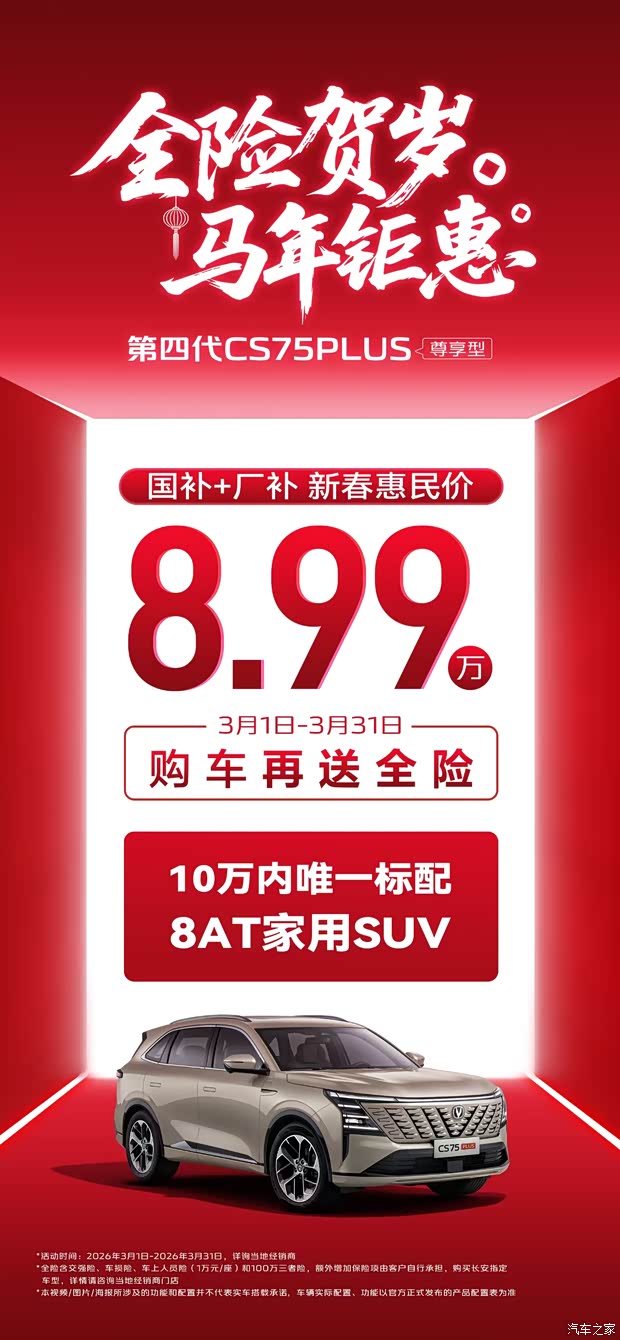 马年开春,长安汽车再放大招!第四代CS75 PLUS尊享型重磅登场,在「全险贺岁 马年钜惠」活动中,叠加国补+厂补后,新春惠民价仅8.99万元,3月1日-31日购车再送全险,以“10万内标配8AT”的硬核实力,重新定义家用SUV的性价比与品质标杆。