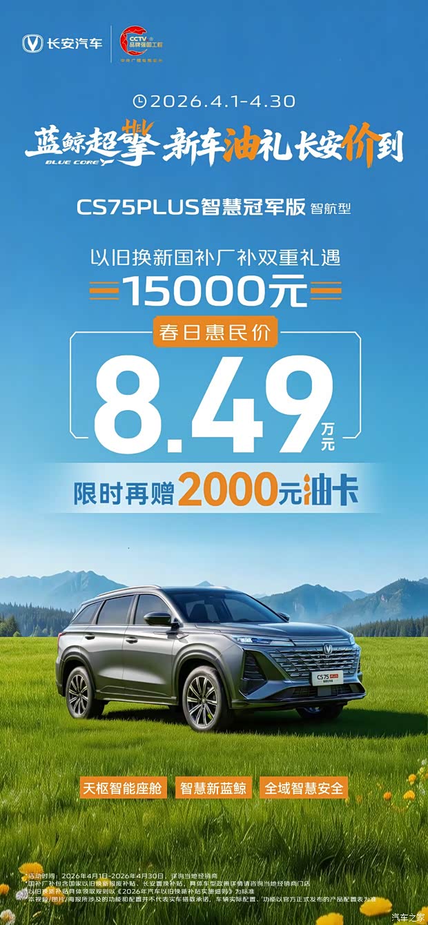 春日焕新正当时,长安汽车重磅让利!CS75PLUS智慧冠军版 智航型重磅登场,以蓝鲸动力+8AT黄金组合、满配智能科技为核心,叠加以旧换新+国补厂补双重礼遇至高15000元,新春惠民价仅8.49万元!限时再赠2000元油卡,把家用SUV“卷王”开回家!
