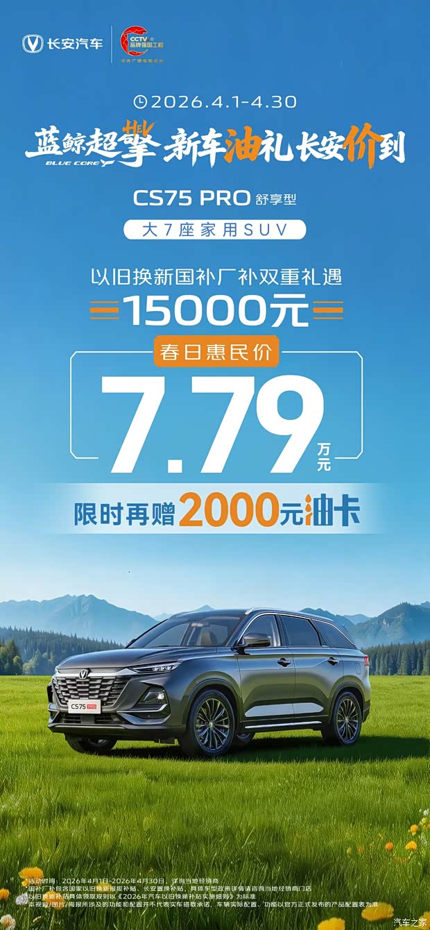 还在为全家出行空间不够发愁?想花8万内买一台能装、能跑、够安全的家用SUV?长安汽车春日惠民风暴来袭!2026款 CS75 PRO 舒享型,真正的大7座家用SUV,限时惠民价仅7.79万元,更限时赠送2000元油卡!性价比直接拉满,二胎家庭、三代同堂出行首选!