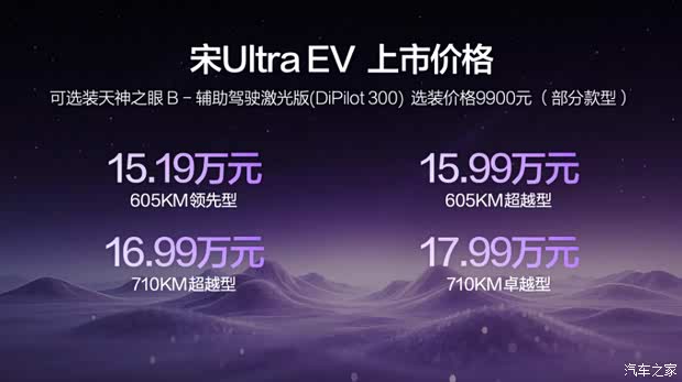 宋Ultra EV可选装天神之眼B-辅助驾驶激光版(DiPilot 300),可以全方位感知复杂路况,即使在复杂路况下也能“耳聪目明”。天神之眼 5.0搭载最新大模型版本,在全闭环端到端的基础上,新增强化学习能力,打造行业领先的辅助驾驶体验。在领先的硬件和软件的协同赋能下,轻松实现路口自主过红绿灯、窄路从容调头、停车场稳稳泊车,还能应对极窄场景、复杂掉头,城区拥堵主动切换辅路,新手也能如老司机般从容出行。