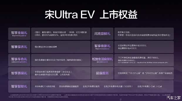 比亚迪王朝正在构建一个从购车、用车、到养车的全链路无忧体系。为此,宋Ultra EV带来了“0元购、0元用、0元养”的超重磅购车权益!同时还有其他丰富权益,为用户带来超值购车体验。