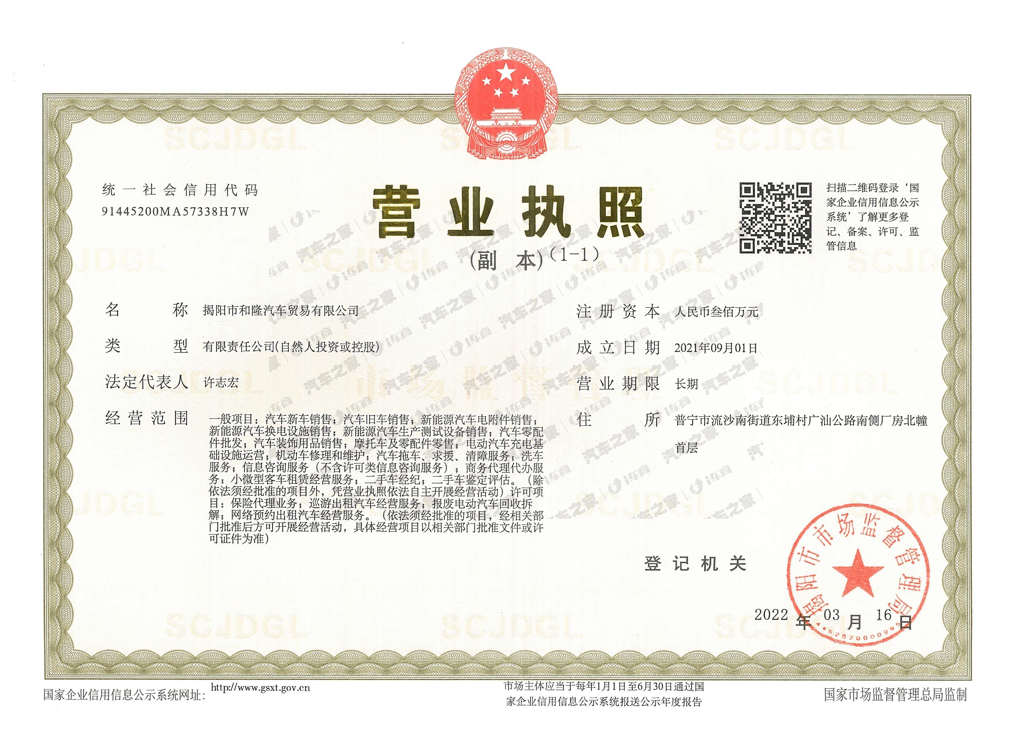 企业在汽车市场具有一定的新势力、影响力和竞争力,且在揭阳市四周地区设立销售服务网点,打造揭阳地区一定影响力的汽车销售公司。公司承诺所有出售的车辆手续齐全,质量保证,完善的售后服务,为客户提供保养、车险理赔、年审、办理运营、代缴违章及税费等一体化服务,真正做到让顾客买的放心,用的舒心。