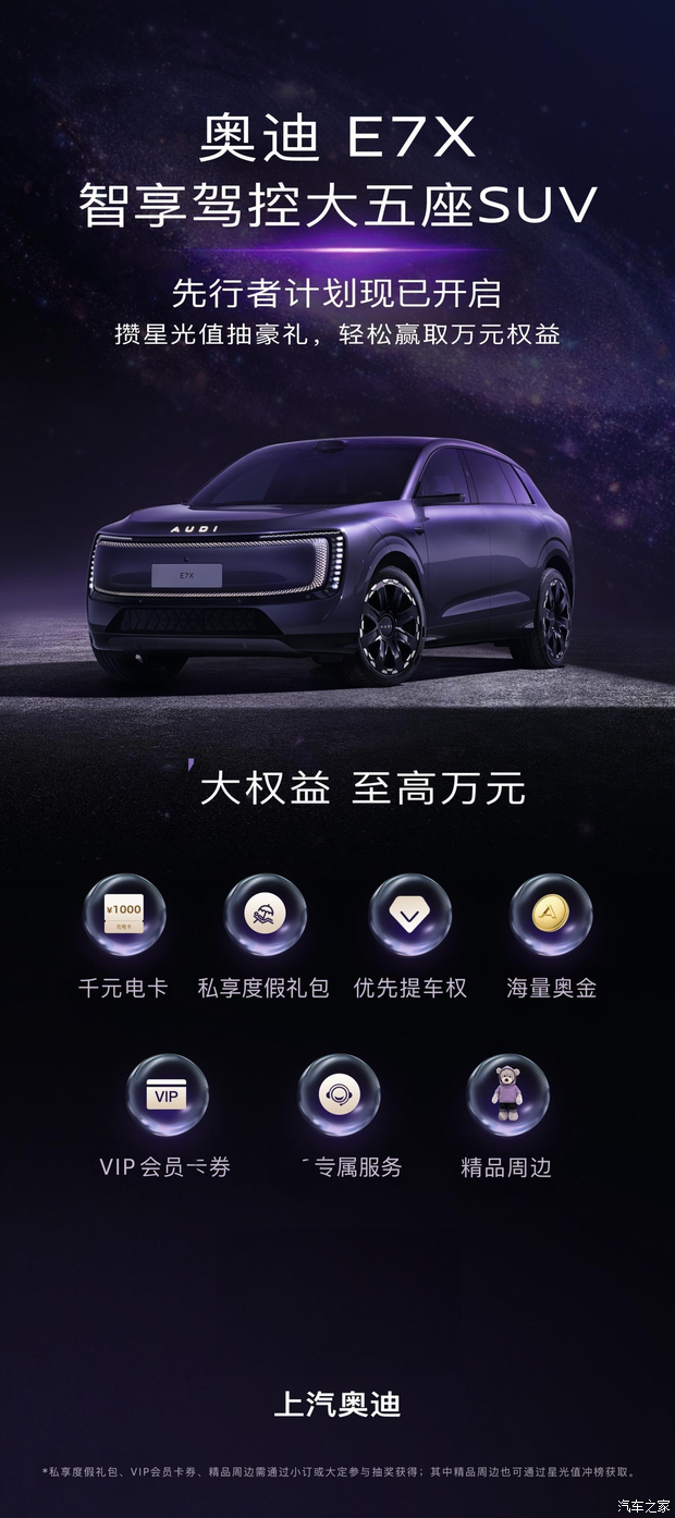 为回馈首批用户的信赖与支持,上汽奥迪同步推出「奥迪 E7X 先行者计划」,用户可通过攒星光值参与抽奖,轻松赢取至高万元专属权益,覆盖购车、用车、生活全场景: