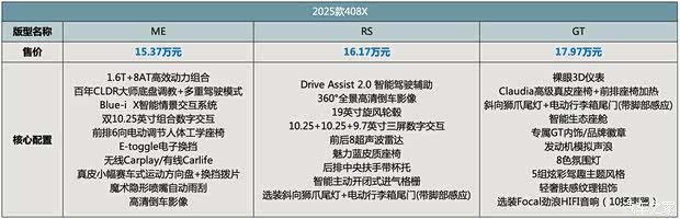 为了更好地满足消费者不断升级的用车需求,2025款408X共推出ME、RS和GT三个版型,在传承408X创新设计、精致内饰和jizhi驾控的基础上,对配置进行了强化升级。
